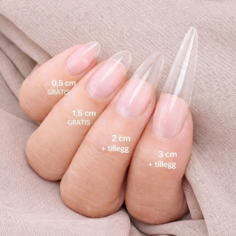 Prisen gjelder for liten til medium lengde (ca. 0–1,5 cm forlengelse fra naturlig negl).